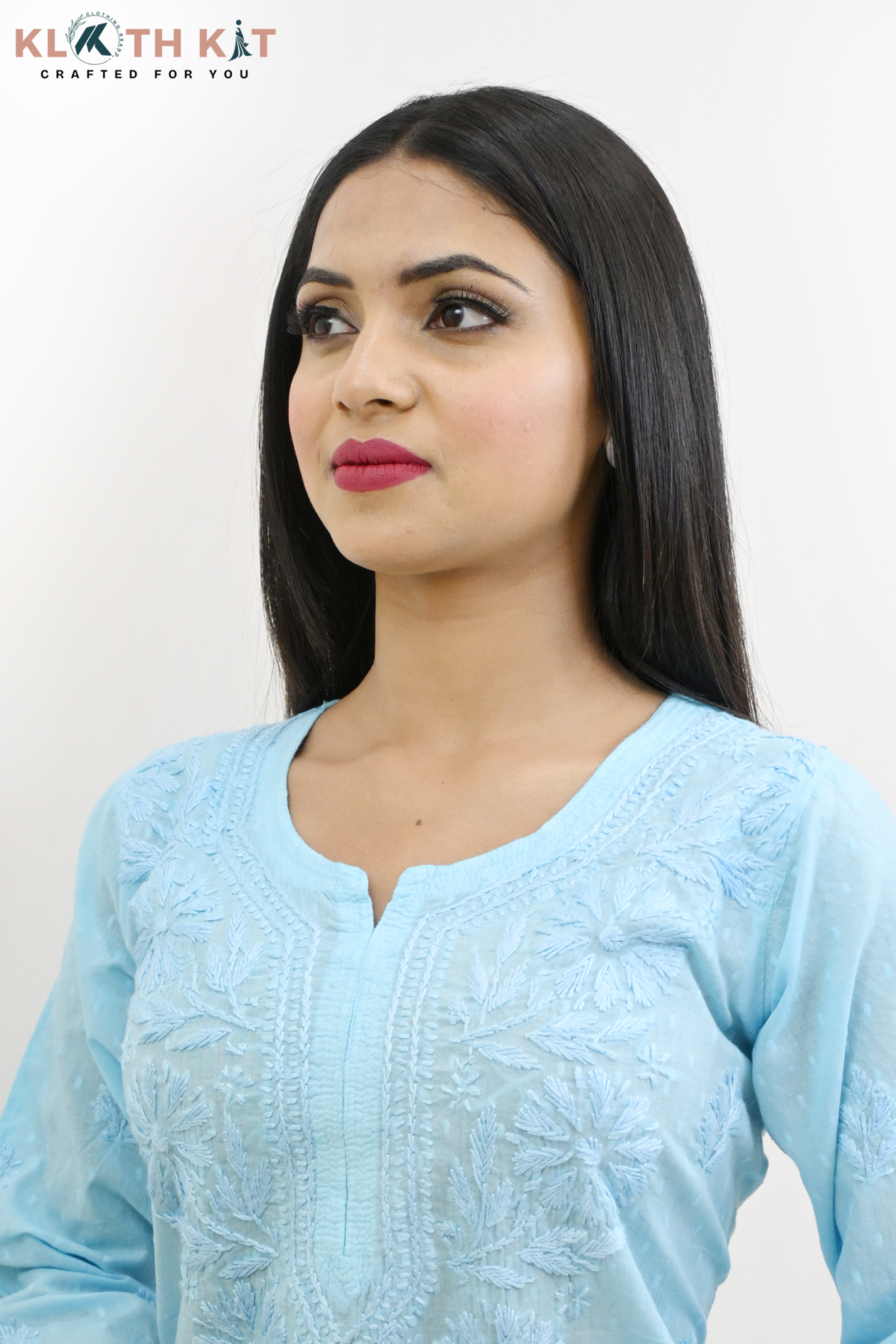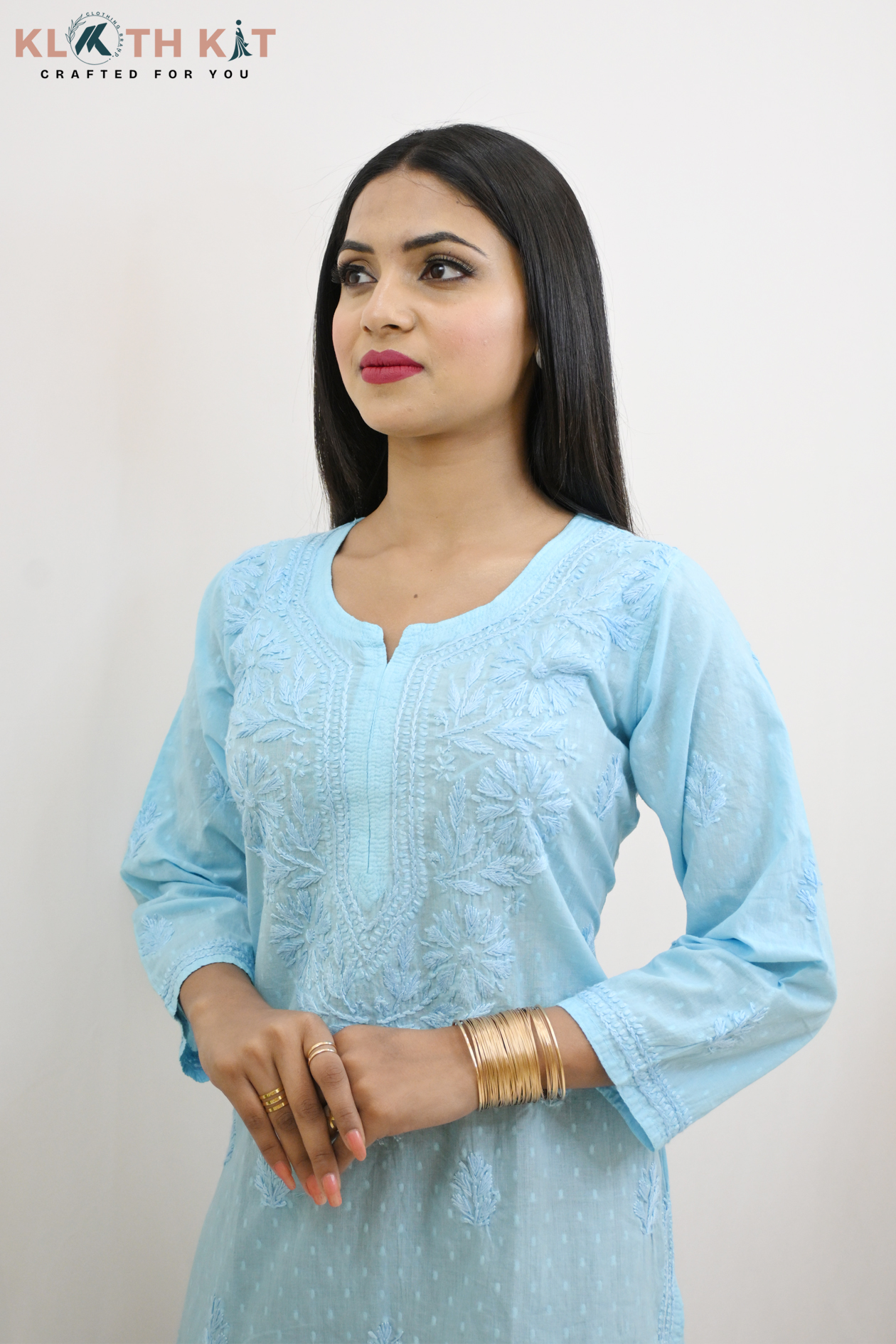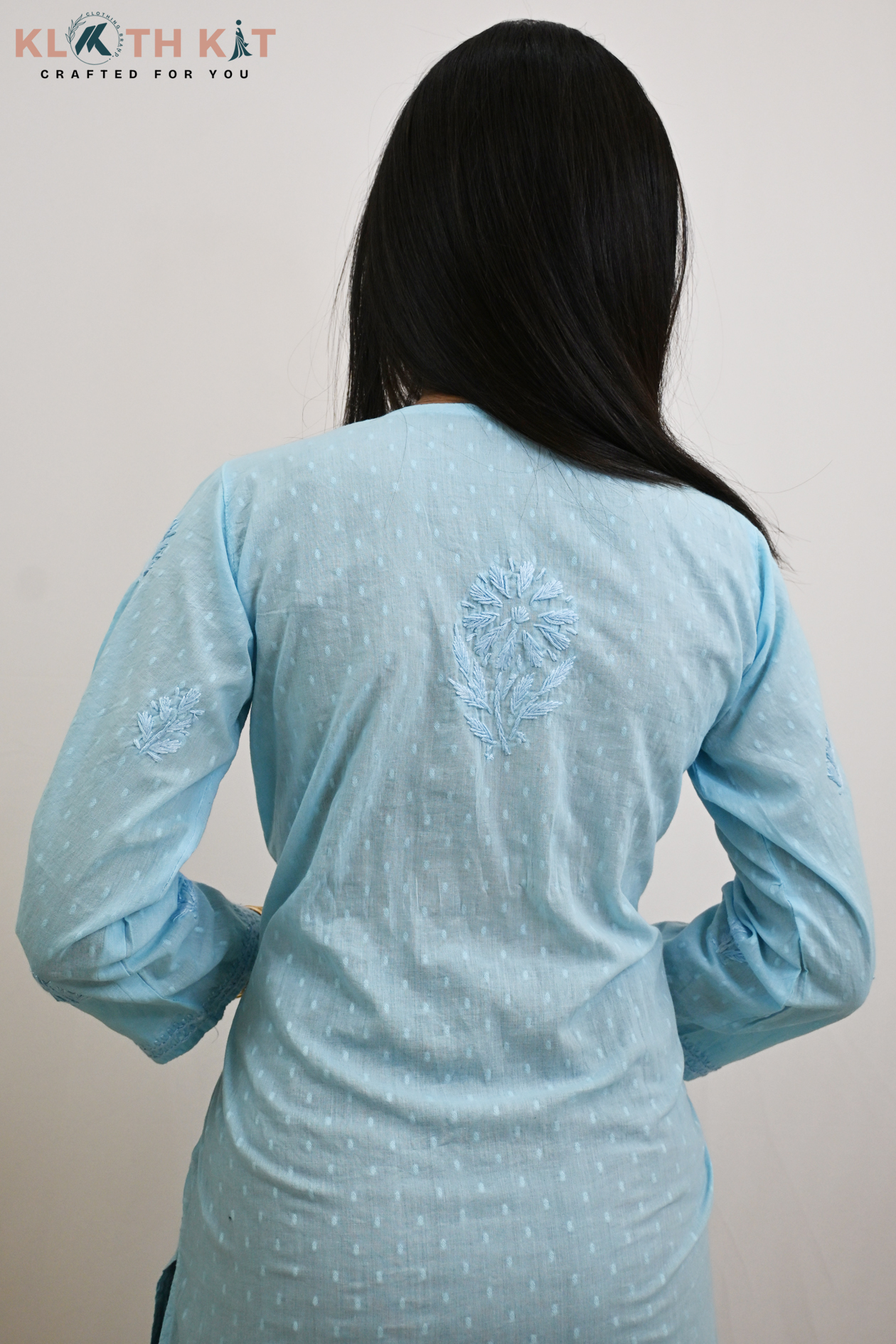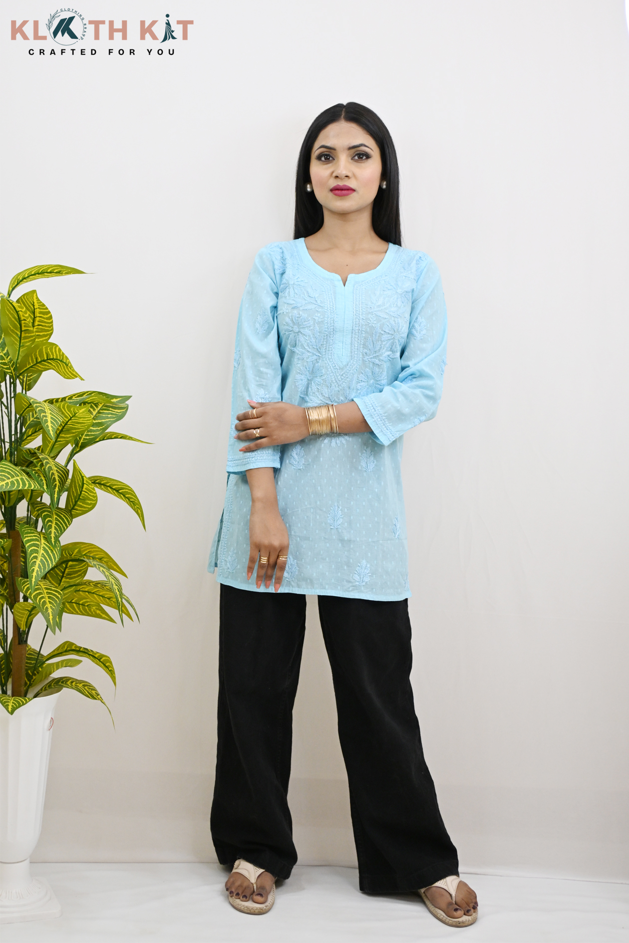 💙✨ Elevate your everyday ethnic wear with our Stylish Sky Blue Mulmul Chikankari Short Kurti, crafted from feather-light mulmul cotton for unmatched comfort and grace. The cool sky blue hue brings a fresh, youthful vibe, while the hand-embroidered chikankari work adds a touch of timeless elegance 🌿🧵.